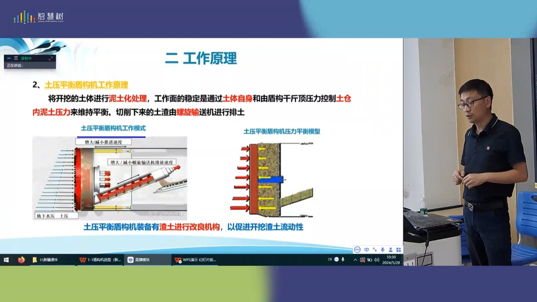 本次同步课堂由四川交通职业技术学院谢武斌老师主讲,新疆交通职业技术学院李震老师协助授课。谢老师通过诙谐有趣的日常生活案例、专业知识重构、清晰可见的实操设备对盾构机及TBM进行了详细的介绍。历时160分钟的云端课堂,在谢老师的精彩授课、学生的积极参与下瞬间而过。