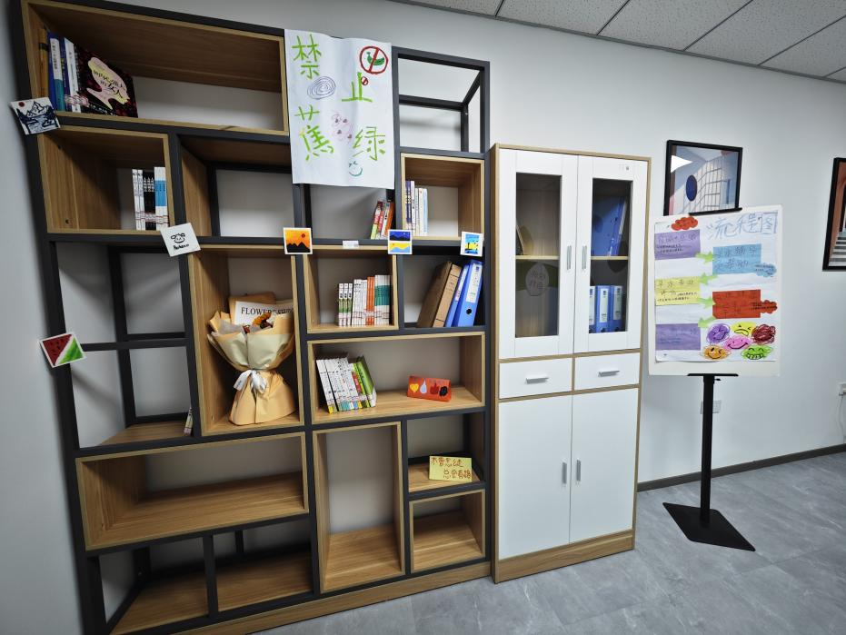 活动中,学工部老师与学生们一起对辅导站的空间布局进行了精心规划。师生围绕如何合理利用有限空间、划分功能区域、休息区、交流区、阅读区等共同商讨布置。经过一番努力,心理辅导站墙面挂上了寓意深刻的装饰画和鼓励心灵的励志标语;功能区摆放了分院心理辅导工作的基本流程图;同时,还为学生们准备了涵盖趣味性与专业性的小测试等细节内容,用来满足不同学生的需求。