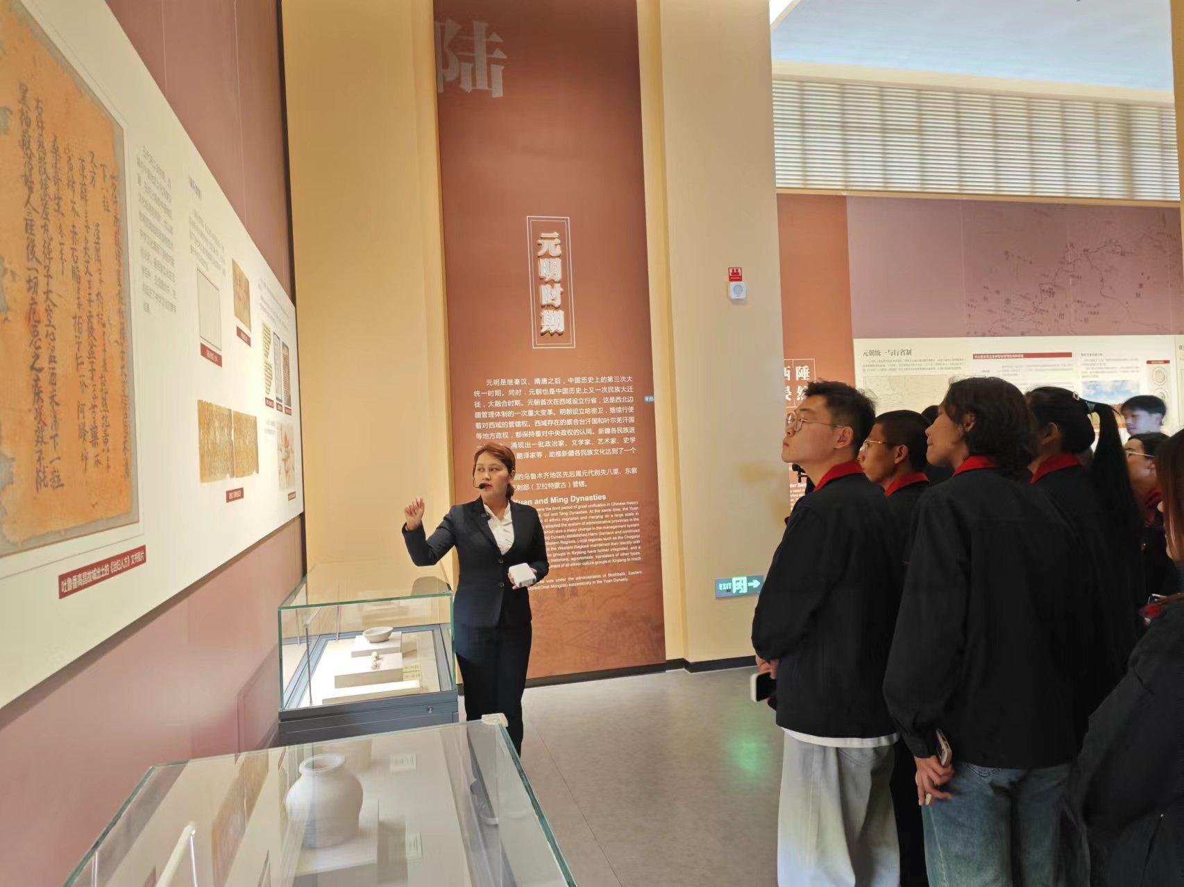 沿着历史的足迹,在解说员的带领下,参加活动的全体师生认真参观了博物馆的各个展厅,这些展厅借助出土实物、3D技术及VR虚拟现实等手段,全方位、多角度地展示了乌鲁木齐的艺术瑰宝,生动再现了乌鲁木齐的历史文化发展变迁。