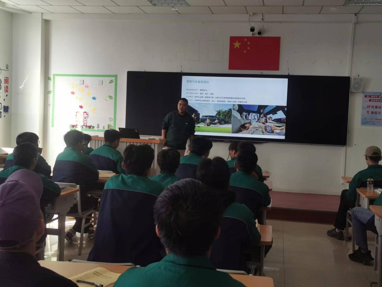 吴勇向订单班学生介绍了理想汽车企业文化、服务团队和人才价值观等三方面内容,加深了同学们对新能源汽车行业现状、理想汽车企业运营理念以及职业岗位发展路径的认知,同学们认真聆听,积极踊跃地参与互动交流,激发了对新能源汽车行业浓厚的兴趣。