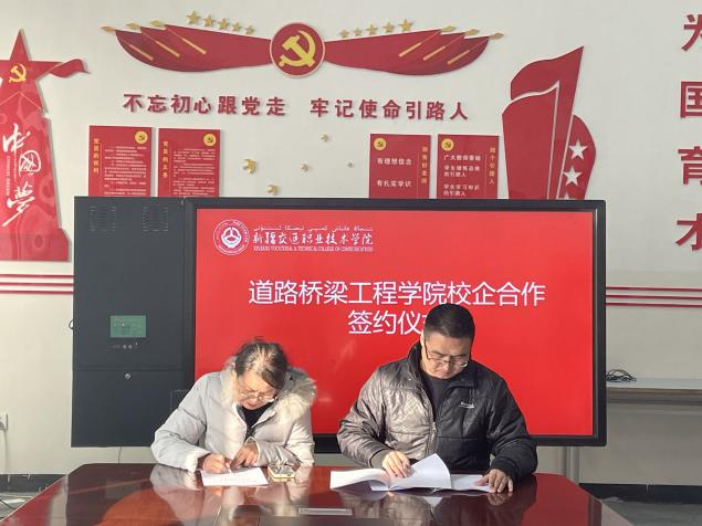 招聘会现场,道路桥梁工程学院领导及专业负责人还积极与多家企业负责人进行了深度沟通,围绕如何深化产学研合作、优化人才培养方案展开了深入探讨,并当场与新疆路育项目管理有限公司以及新疆广耀建设工程有限公司签订了校企合作协议,为后续人才培养与企业发展的协同共进奠定了良好基础。