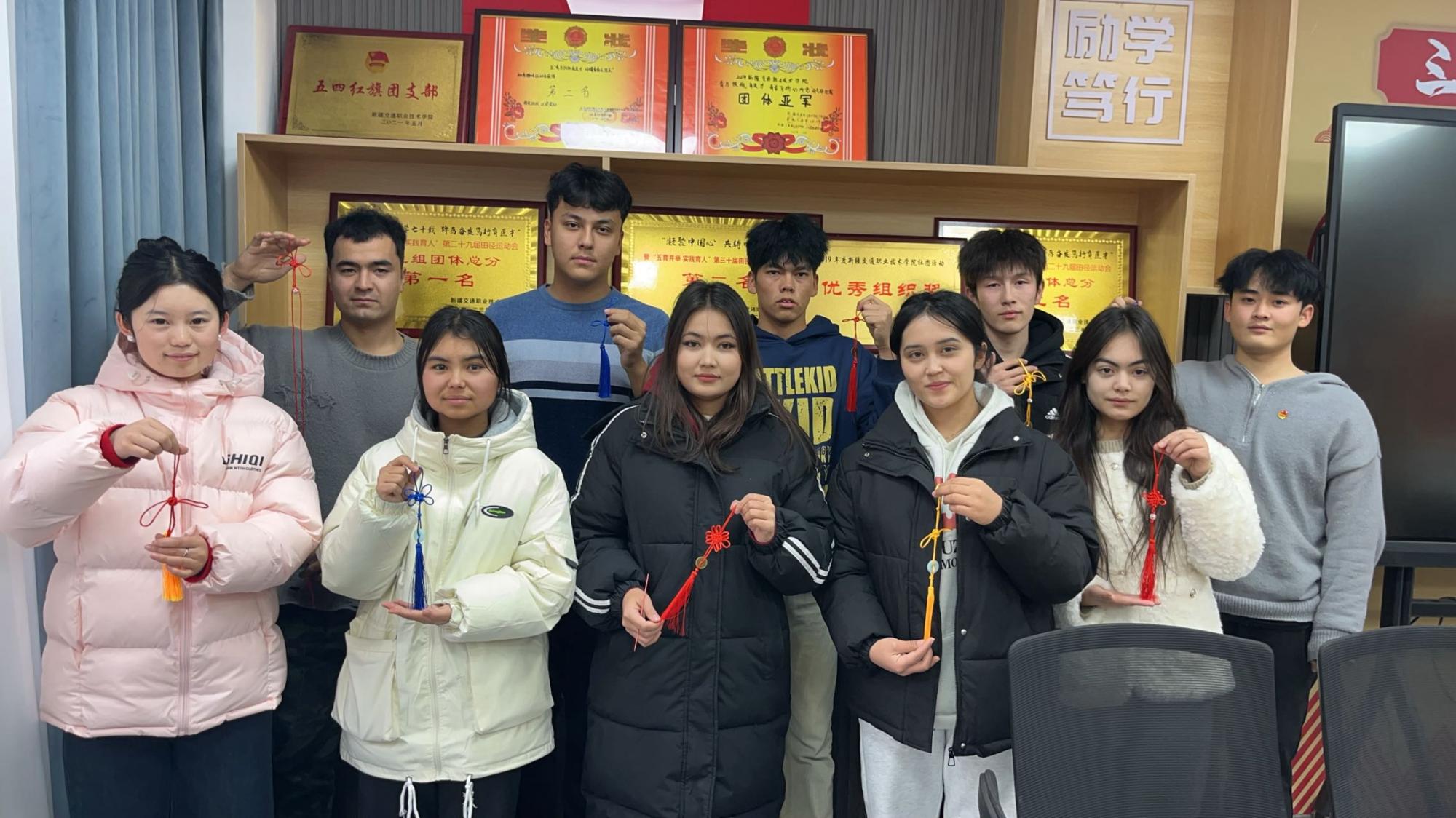 活动伊始,学院政治辅导员杨莉向同学们详细介绍了中国结的历史渊源及其象征意义,使大家对这一传统手工艺品有了更深入的了解。随后,新能源 D241 班的王毅帆同学凭借精湛的编织技艺,现场指导同学们制作中国结。从绕绳、打结到穿梭、定型,同学们在她的耐心指导下,一步步完成了自己的作品。在制作过程中,同学们相互帮助、彼此学习,现场气氛热烈而融洽。来自改装 D241 班的阿尔孜古丽·谢木西同学开心地说:“这次活动不仅让我学会了编织中国结,还结识了许多新朋友,大家的心更近了。”