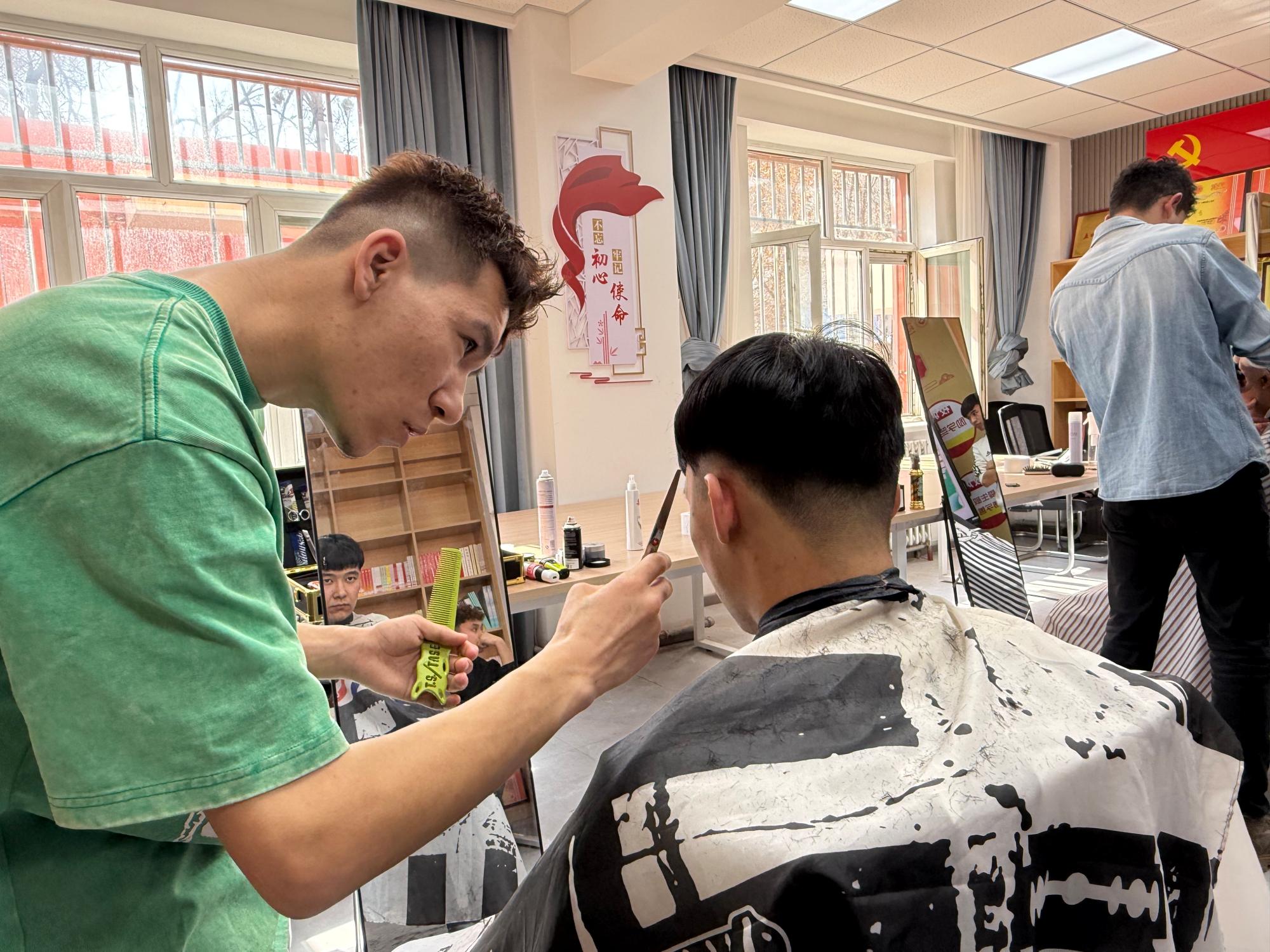 活动当天,志愿者们在“一站式”的红色书屋搭起了临时理发点,4位“Tony老师”准备好理发工具,热情迎接前来理发的师生。活动现场井然有序,志愿者们耐心询问每位的需求,并根据他们的喜好精心设计发型。无论是简单的修剪,还是时尚的发型设计,志愿者们都认真对待,力求让每一位同学满意。