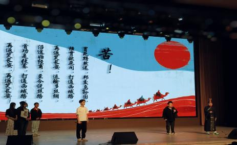 活动伊始,主持人以“有朋自远方来,不亦乐乎”的热情开场,将现场观众带入了诗词的世界。道桥D241班的红色诵读《信仰》燃起了现场的气氛,土木G231班的《白杨礼赞》以铿锵有力的朗诵,展现了茅盾笔下白杨树的坚韧品格;《离骚》选段则通过深情的演绎,让观众感受到屈原“虽九死其犹未悔”的爱国情怀。特别编排的情景剧《丝路华章》以生动的表演再现了“黄沙百战穿金甲,不破楼兰终不还”的边塞豪情,带领观众重走千年丝绸之路。
