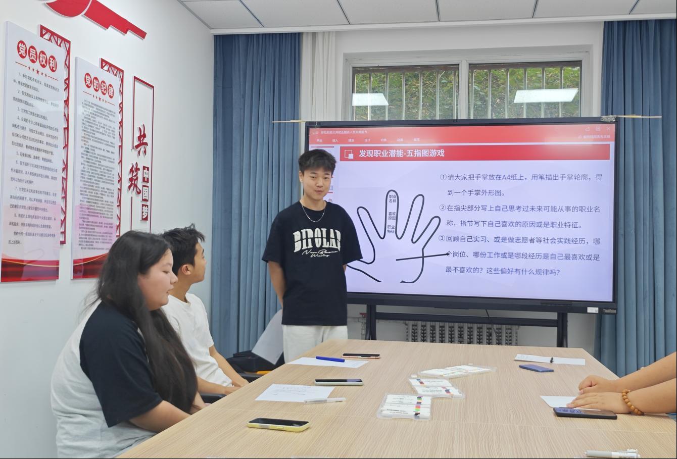 活动开始,工作人员为参与同学发放A4纸、彩笔等材料。主讲人杨娟老师以“用手掌丈量职业理想”为切入点,详细讲解“生涯五指图”的绘制逻辑:将手掌轮廓描摹于纸上,五根指尖分别对应“目标职业名称”,指节区域则需填写“选择该职业的核心动机”或“职业关键特征”。“这不仅是一幅手绘作品,更是一次自我对话——通过视觉化呈现,帮助大家更清晰地梳理兴趣、能力与职业期待的关联。”杨娟老师的引导引发了同学们的热烈思考。