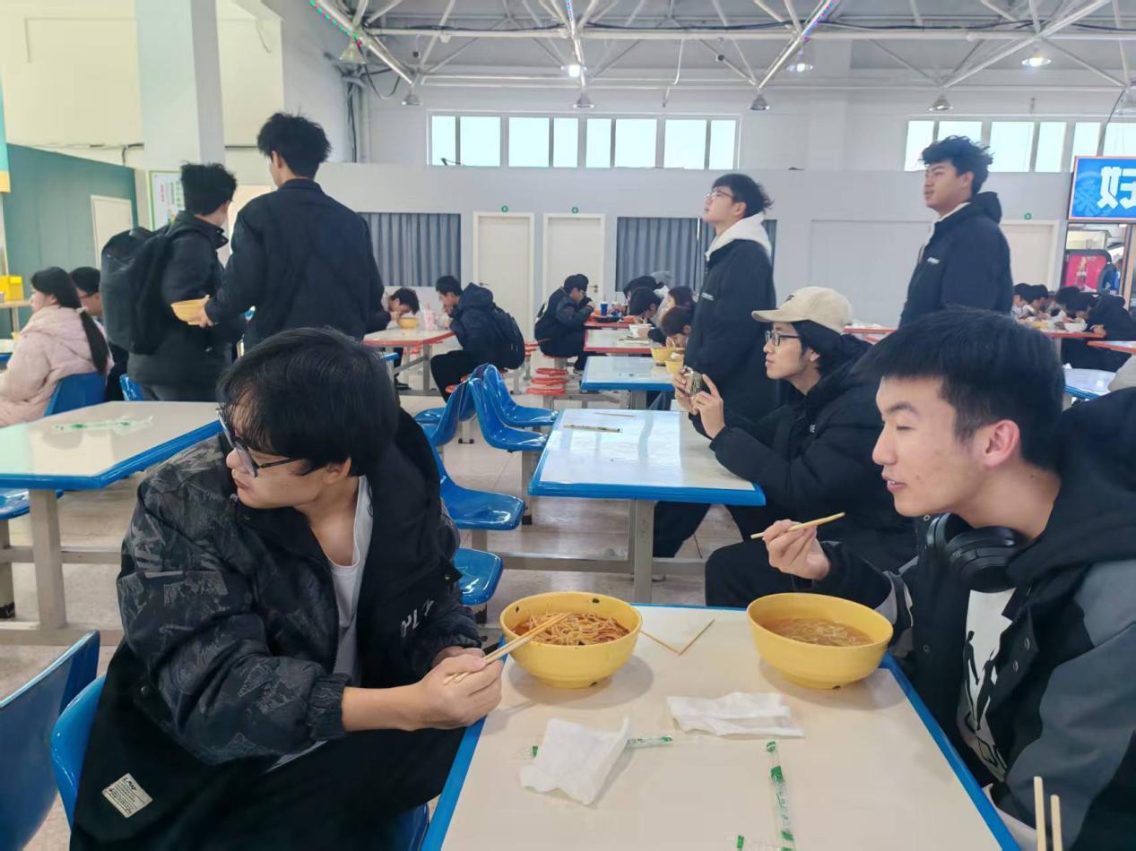 活动于午间人流高峰时段在食堂区域拉开帷幕。随着《向阳而生》温暖激昂的旋律响起,身着统一服装、手持国旗与主题手举牌的学生骨干,从食堂各角落有序汇聚至中央区域,迅速营造出昂扬庄重的氛围。低沉有力的背景乐中,成员们以整齐队列展开集体朗诵——诗化语言回溯1935年北平学子在民族危亡之际振臂高呼的历史瞬间:“停止内战,一致对外”的呐喊穿越时空,“传单纷飞如蝶载赤子热望”的画面历历在目,将现场师生的思绪拉回那段风雪激荡、热血澎湃的岁月。
