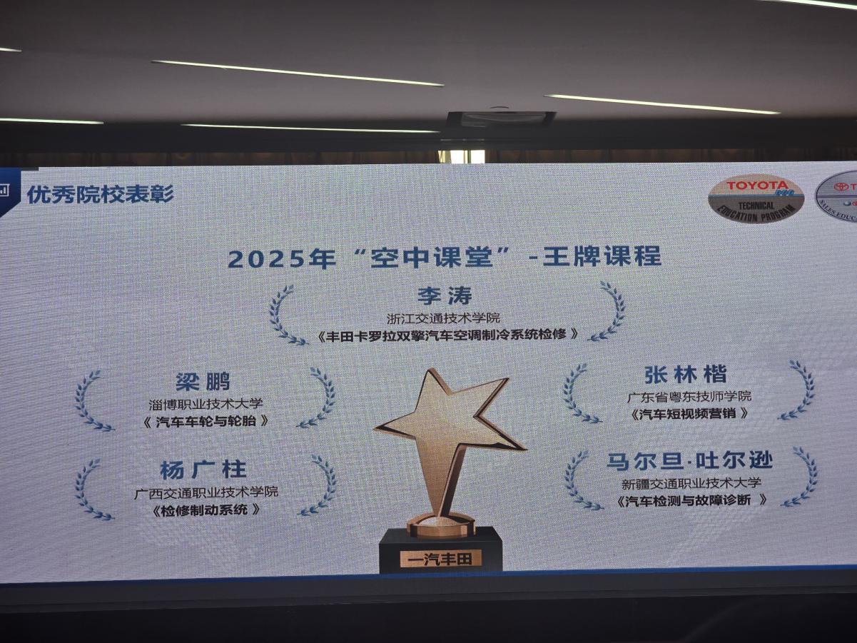 本次大赛是丰田T-TEP项目体系内最具影响力的教学赛事之一,历时近两个月,吸引了全国19所院校的优秀教师参与。赛事以“空中课堂”为载体,聚焦汽车技术教育的创新实践与产教融合落地,要求参赛课程既符合行业前沿技术标准,又能体现职业教育的实践性与趣味性。马尔旦老师的参赛课程《智能网联汽车故障诊断》,融合了丰田最新技术规范与我校实训教学经验,通过“虚拟仿真+实景操作”的双场景教学模式,生动展现了智能汽车维修的核心技能,最终在激烈角逐中斩获奖项。