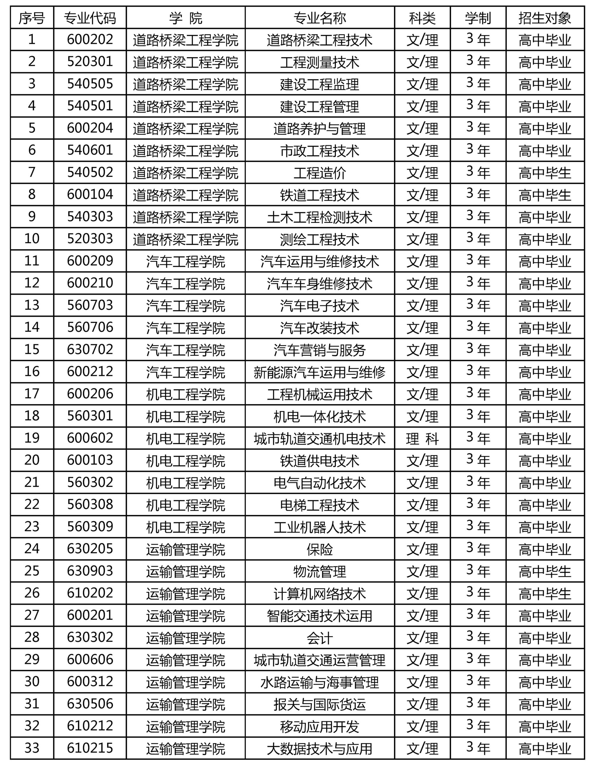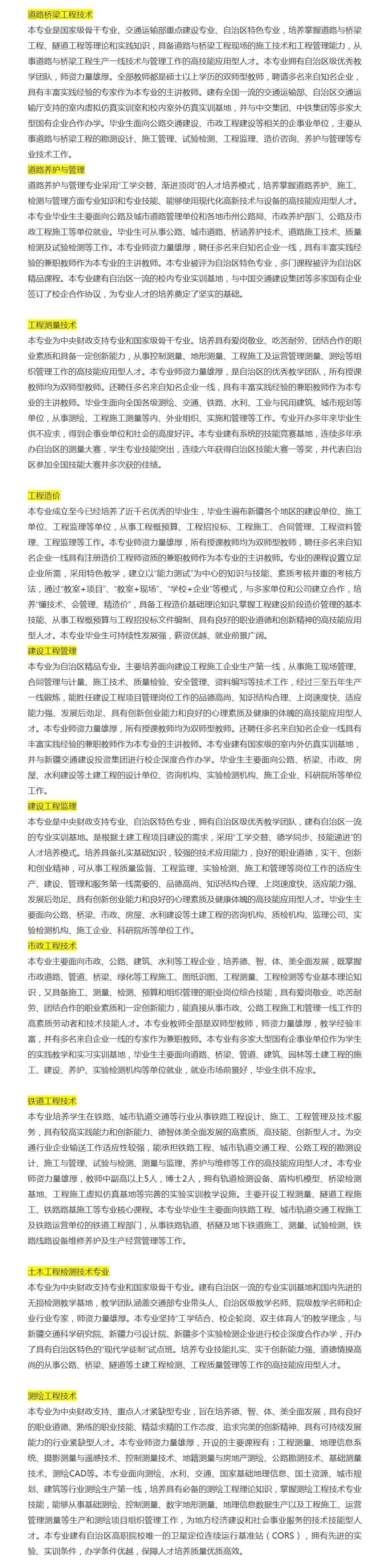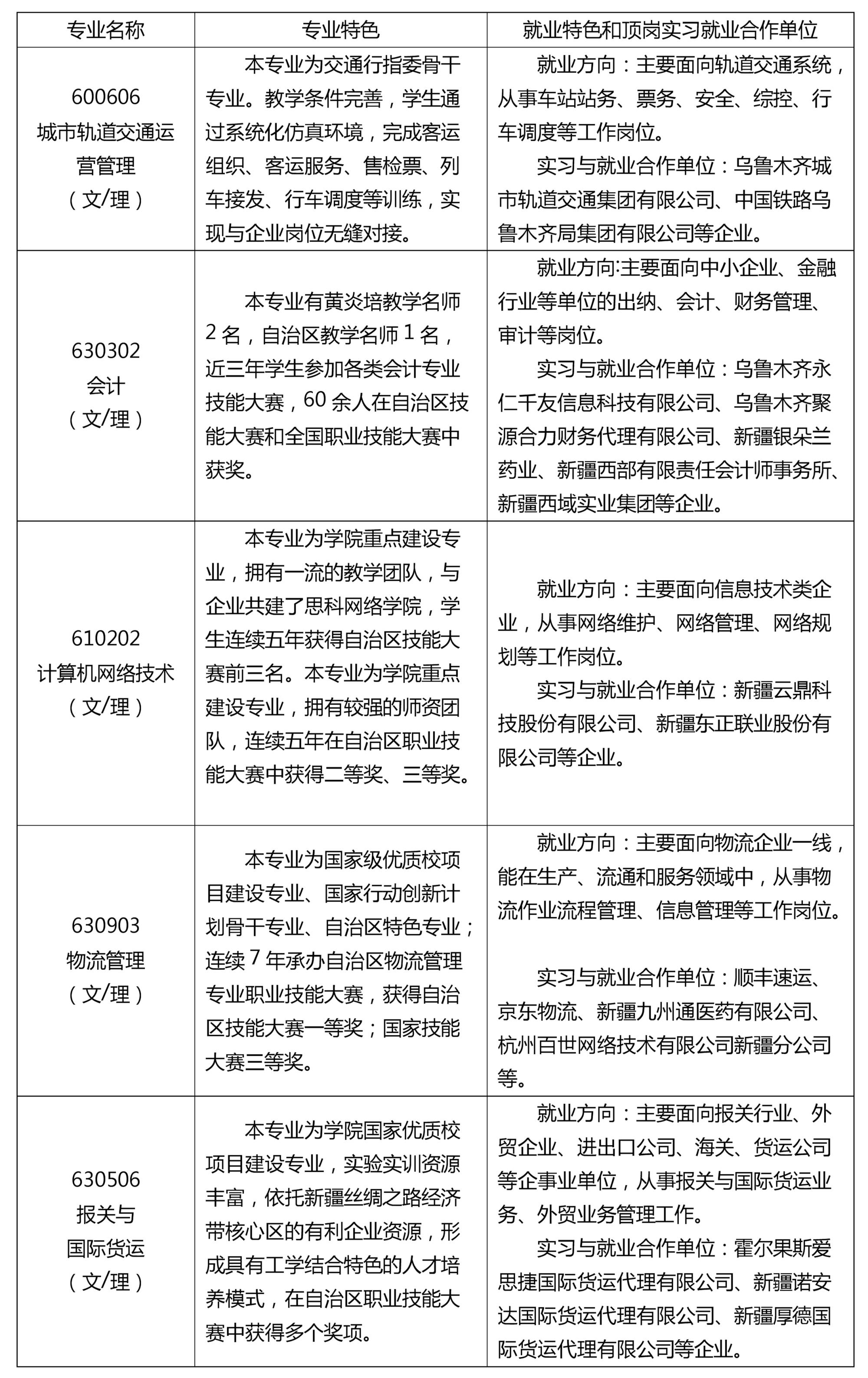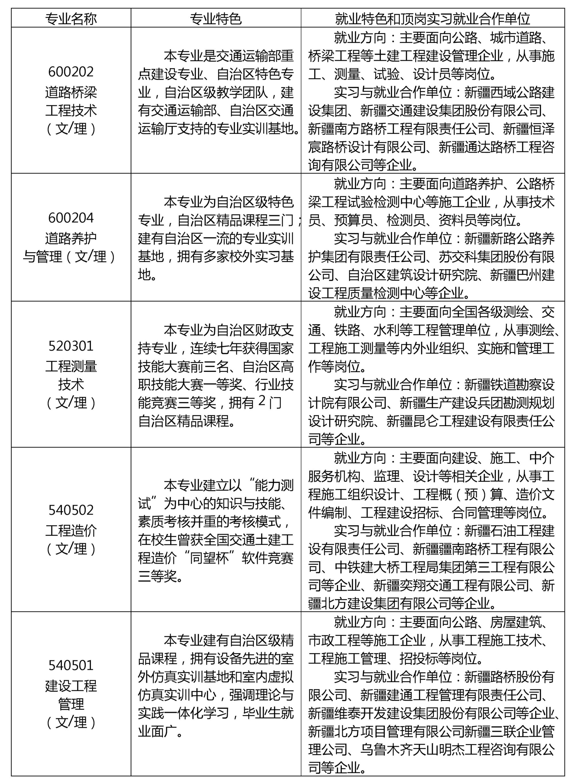 学院主动适应国家“一带一路”和新疆经济社会发展对人才的需求,突出综合交通运输行业特色,围绕着综合交通发展设有道路桥梁工程学院、汽车工程学院、机电工程学院、运输管理学院、人文基础教育学院、马克思主义学院、继续教育学院七个教学分院。开设有道路桥梁工程技术、汽车运用与维修技术、铁道工程技术、城市轨道交通运营管理、水路运输与海事管理、报关与国际货运等38个高职专业。现已建成自治区级特色专业9个、中央财政支持专业4个。学院积极推进校企合作、产教融合,依托道路桥梁工程、交通运输工程、机械电子工程、汽车运用工程四个研究中心积极为行业、企业提供技术服务,提升学院科研水平及服务社会能力。