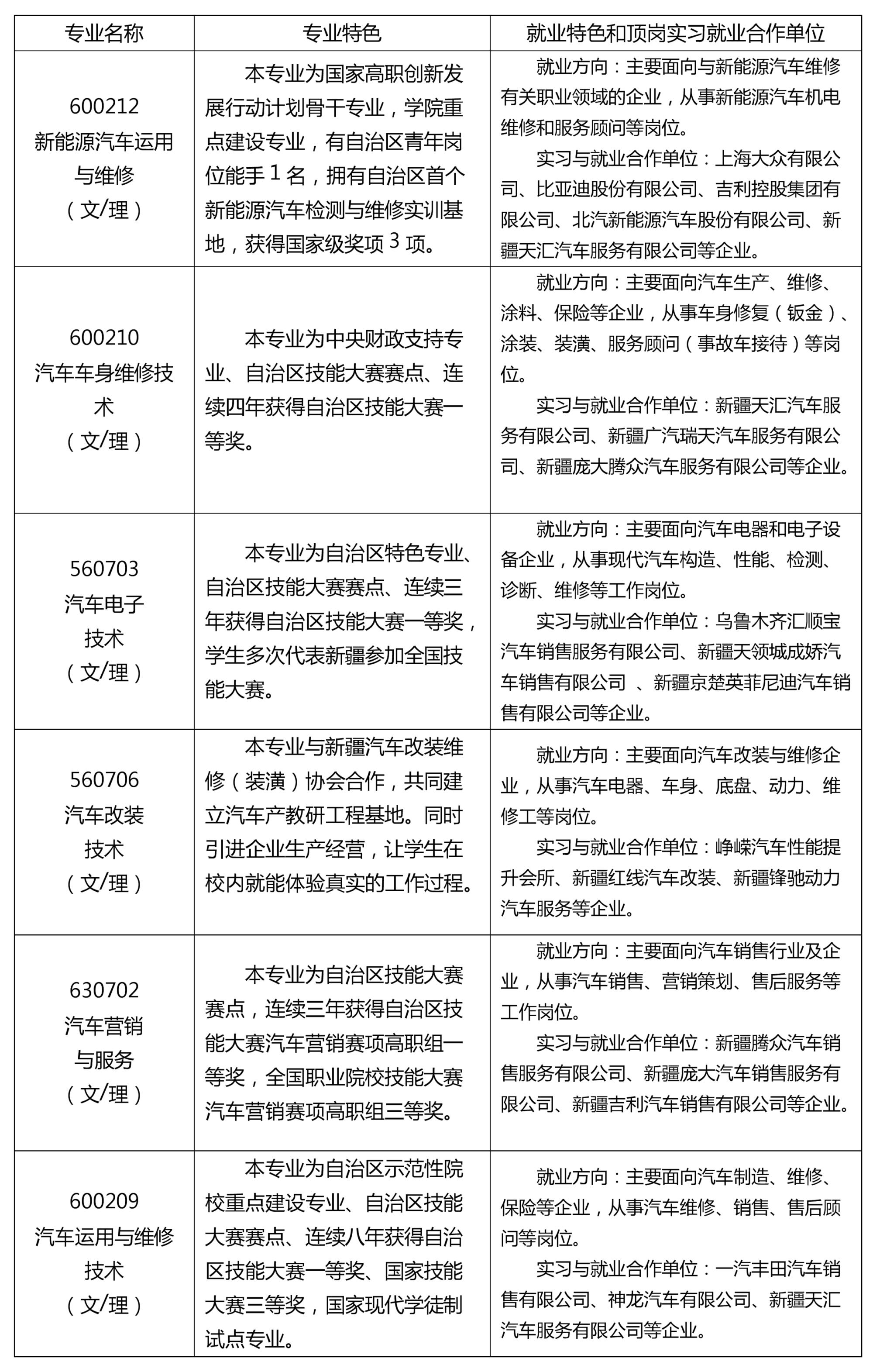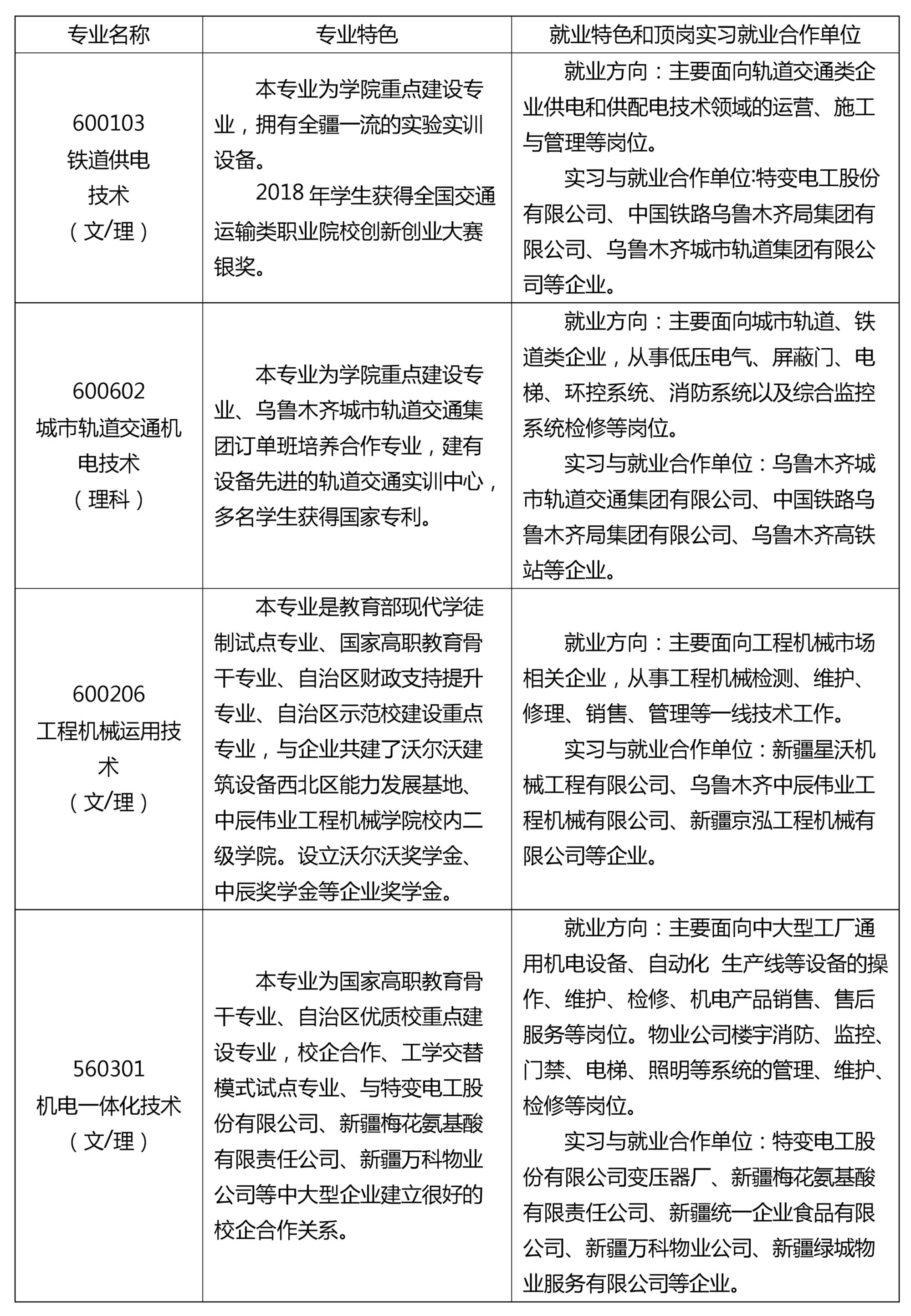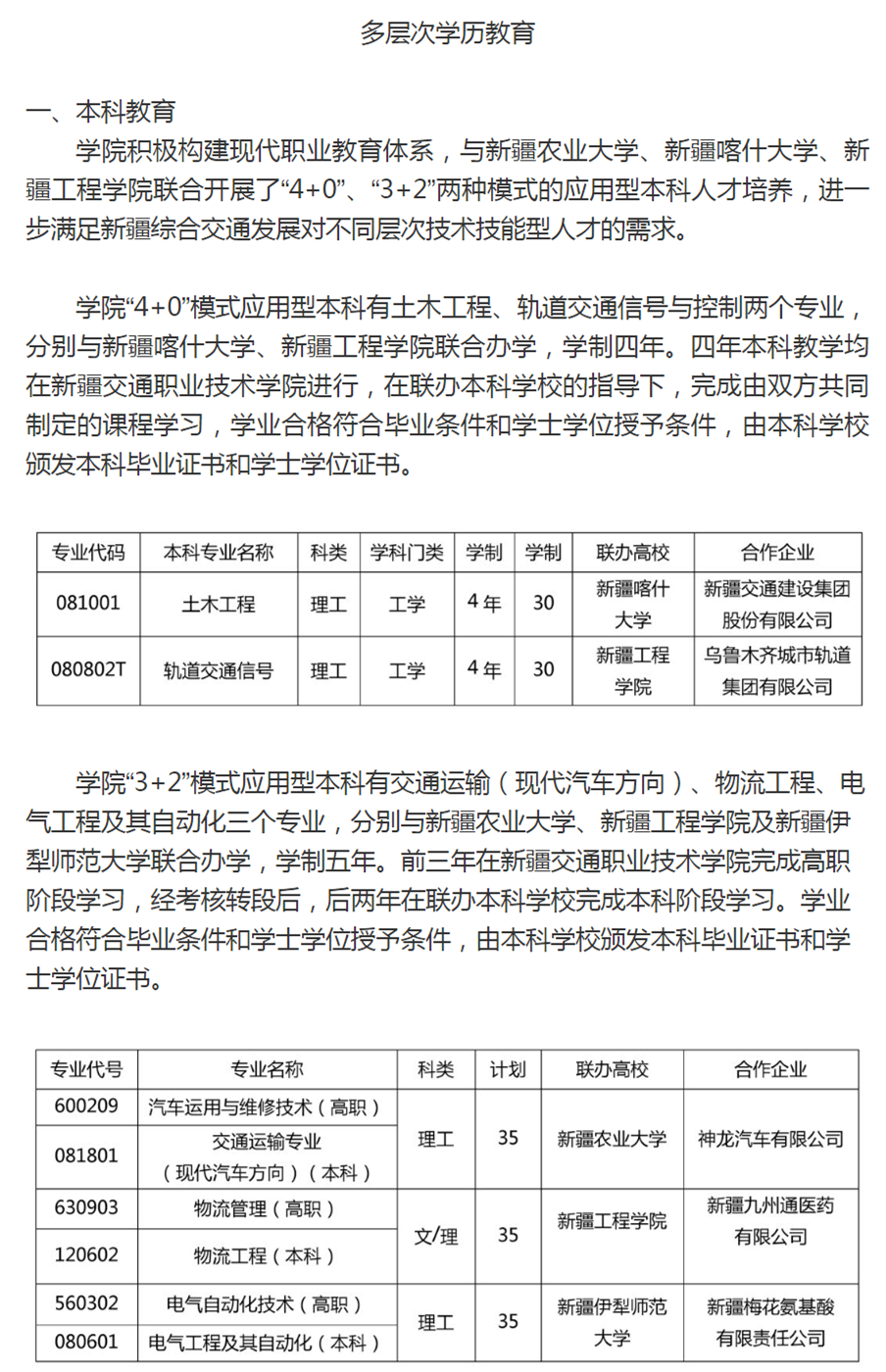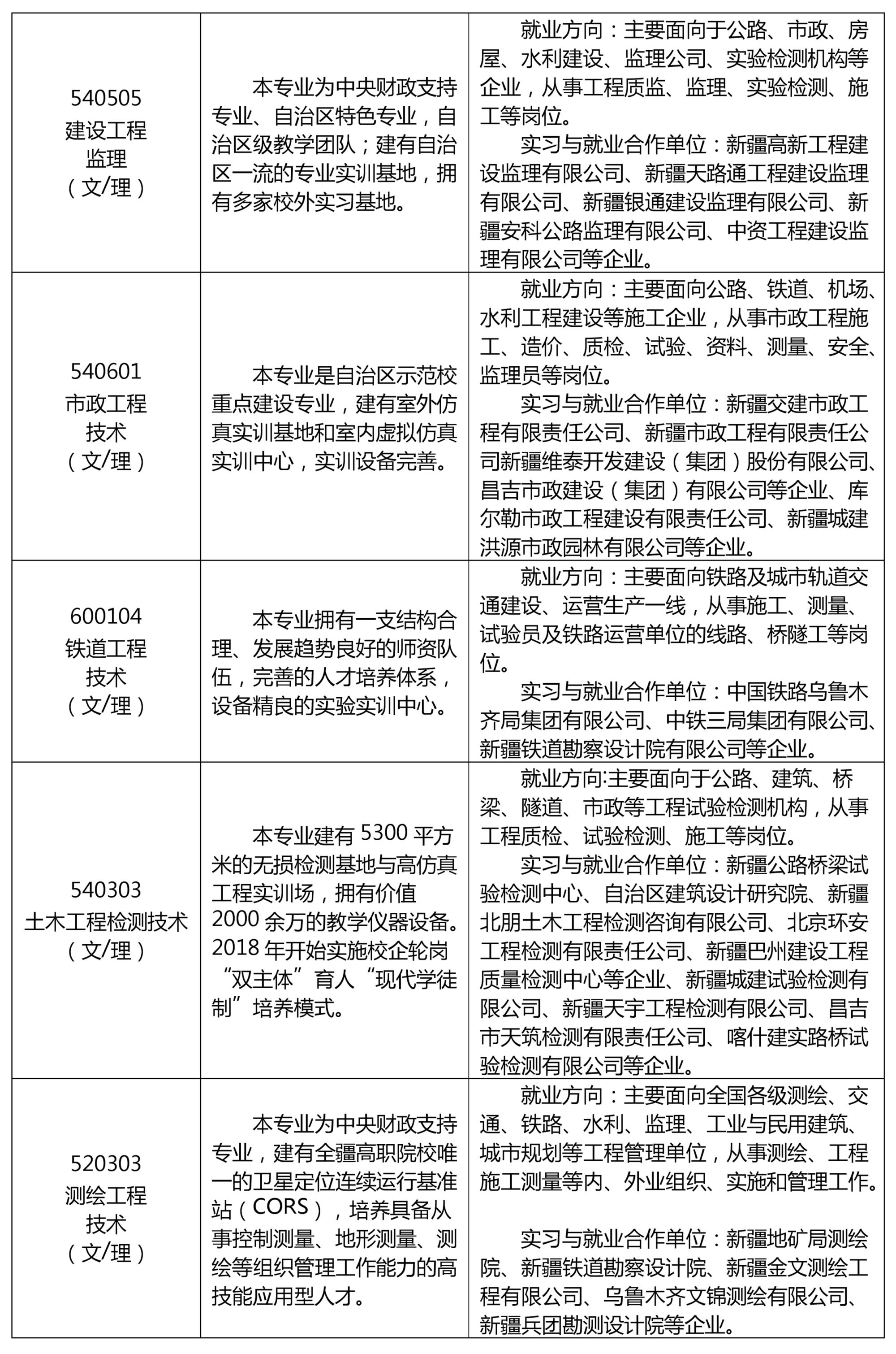 学院主动适应国家“一带一路”和新疆经济社会发展对人才的需求,突出综合交通运输行业特色,围绕着综合交通发展设有道路桥梁工程学院、汽车工程学院、机电工程学院、运输管理学院、人文基础教育学院、马克思主义学院、继续教育学院七个教学分院。开设有道路桥梁工程技术、汽车运用与维修技术、铁道工程技术、城市轨道交通运营管理、水路运输与海事管理、报关与国际货运等38个高职专业。现已建成自治区级特色专业9个、中央财政支持专业4个。学院积极推进校企合作、产教融合,依托道路桥梁工程、交通运输工程、机械电子工程、汽车运用工程四个研究中心积极为行业、企业提供技术服务,提升学院科研水平及服务社会能力。