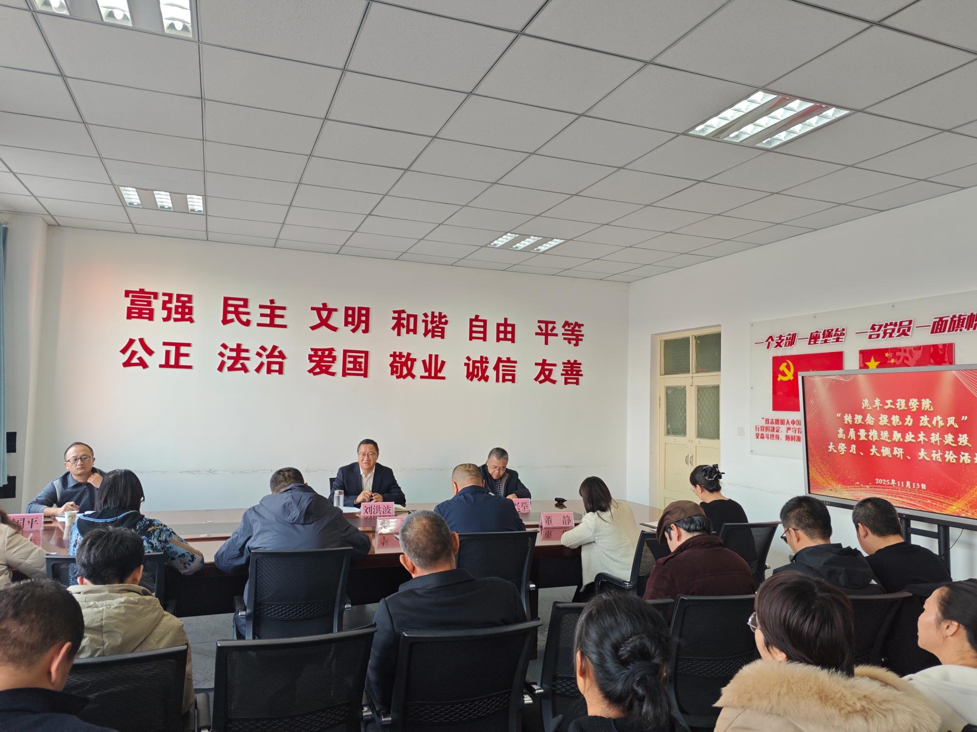 11月13日,党委书记刘洪波深入汽车工程学院,围绕“大学习、大调研、大讨论”活动开展专题调研座谈会,实地了解学院在职业本科新起点上的建设思路与发展规划,并就职业本科专业建设提质增效提出明确要求。
